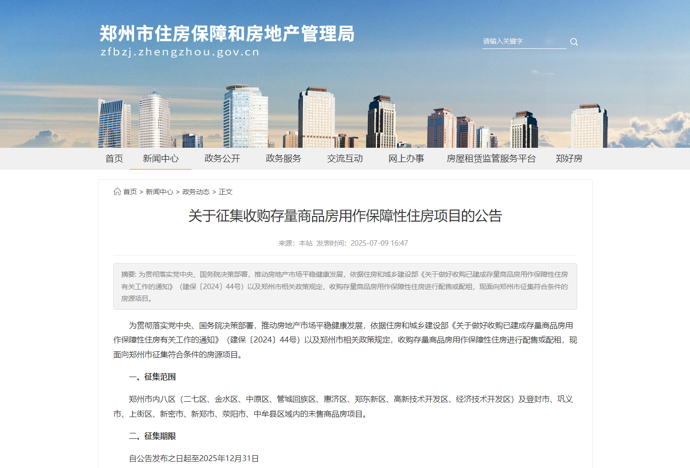 為貫徹落實(shí)黨中央、國(guó)務(wù)院決策部署,推動(dòng)房地產(chǎn)市場(chǎng)平穩(wěn)健康發(fā)展,依據(jù)住房和城鄉(xiāng)建設(shè)部《關(guān)于做好收購(gòu)已建成存量商品房用作保障性住房有關(guān)工作的通知》(建保〔2024〕44號(hào))以及鄭州市相關(guān)政策規(guī)定,收購(gòu)存量商品房用作保障性住房進(jìn)行配售或配租,現(xiàn)面向鄭州市征集符合條件的房源項(xiàng)目。
