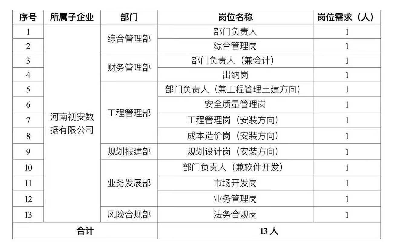 根據河南鐵建投物流有限公司工作計劃,為滿足河南視安數據有限公司項目建設運營人才需求,確保數字物流綜合服務多式聯運智慧樞紐項目建設、倉儲、信息化服務等高鐵物流業務順利實施。現面向社會公開招聘13人,有關事宜公告如下: